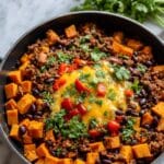 This Amazing 30-Minute Sweet Potato Skillet Dinner is a hearty and flavorful one-pan meal featuring ground beef, sweet potatoes, black beans, and diced tomatoes with green chilies. Perfect for a quick and nutritious weeknight dinner, this skillet combines warming spices and fresh herbs for a balanced and satisfying dish.