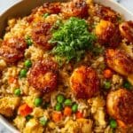 Bang Bang Fried Rice is a flavorful and spicy stir-fried rice dish featuring tender chicken, fluffy scrambled eggs, crisp vegetables, and a creamy, tangy sauce made with mayonnaise, Thai sweet chili sauce, sriracha, and soy sauce. Quick to prepare and perfect for a satisfying weeknight dinner, this dish combines sweet, spicy, and savory flavors with a delightful crispy texture.