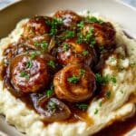 - Assemble and Serve: Spoon a generous portion of mashed potatoes onto plates. Arrange sausages on top, then ladle onion gravy over. Garnish with fresh parsley and crispy fried onions if desired. Serve immediately.