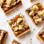 - Add Chocolate Chips and Cookie Crumble: Sprinkle the milk chocolate chips evenly across the caramel layer. Then crumble the remaining quarter of the cookie dough over the top, distributing it evenly for a delicious crumbly finish.
