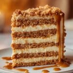 - Assemble the Cake: Place one cake layer on a serving plate. Spread a layer of cream cheese filling, then sprinkle some streusel, and drizzle caramel sauce over. Repeat the layering process with remaining cakes, filling, streusel, and caramel. Finish with streusel on top and a generous caramel drizzle for a beautiful finish.