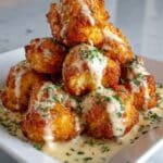 The image shows a pile of golden brown fried cauliflower pieces stacked high on a white square plate. The cauliflower looks crispy on the outside with a rough texture, and it is coated with a creamy white sauce that drips down the sides. Green herbs are sprinkled over the top, adding a fresh touch of color. The plate sits on a white marbled surface. photo taken with an iphone --ar 4:5 --v 7