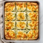 This image shows a rectangular baked dish cut into twelve equal rectangular pieces, arranged in three columns and four rows. The top layer is a golden-browned melted cheese scattered with small green herb bits. Below this cheese topping, hints of a green mixture suggest a creamy herb or vegetable filling, with the edges slightly browned from baking. The dish is in a shallow silver baking pan placed on a white marbled textured surface. Photo taken with an iphone --ar 4:5 --v 7