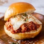 Chicken Parmesan Sloppy Joes combine the comforting flavors of Italian chicken Parmesan with the casual ease of sloppy joes. This recipe features lean ground chicken cooked with onions, marinara sauce, and pesto, then topped with Parmesan and mozzarella cheese, all served on toasted brioche buns for a delicious and hearty meal perfect for weeknight dinners.