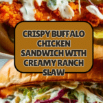 A crispy and flavorful chicken sandwich with a spicy buffalo twist, paired with a creamy and tangy homemade ranch slaw. Perfectly marinated chicken breasts are dredged in a seasoned flour mixture, deep-fried to golden perfection, then tossed in buffalo sauce and served on toasted brioche buns with fresh, crunchy ranch slaw for a deliciously satisfying meal.