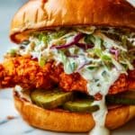 A crispy and flavorful chicken sandwich with a spicy buffalo twist, paired with a creamy and tangy homemade ranch slaw. Perfectly marinated chicken breasts are dredged in a seasoned flour mixture, deep-fried to golden perfection, then tossed in buffalo sauce and served on toasted brioche buns with fresh, crunchy ranch slaw for a deliciously satisfying meal.