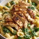 This Chicken Spinach Penne is a creamy, comforting pasta dish that’s easy to prepare on a weeknight. Tender pieces of chicken combine with spinach and a luscious Parmesan cream sauce, making it a family favorite in no time.