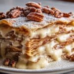A close-up of a layered dessert with multiple thin crepe layers stacked on top of each other, each crepe is golden-brown with a soft, slightly glossy texture. Between every crepe layer is a creamy, light beige filling that looks smooth and thick, slightly oozing out at the sides. The top layer is dusted evenly with powdered sugar and sprinkled with small pieces of pecans, which add a rich, brown color and crunchy texture. The dessert sits on a white plate, placed on a white marbled surface. Photo taken with an iphone --ar 4:5 --v 7