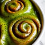 - Glaze and Serve: Remove the cinnamon rolls from the oven and immediately brush or drizzle the matcha glaze over the top. Serve warm for the best flavor and texture.