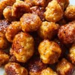 The image shows many small, golden-brown fried pieces that look crispy on the outside with some darker spots of browning. Each piece is roughly round and bumpy, tightly packed together, with a shiny glaze giving them a slight oily look. The background is a white marbled surface, making the warm tones of the food stand out. photo taken with an iphone --ar 4:5 --v 7