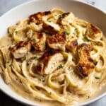 A white bowl filled with creamy fettuccine Alfredo pasta topped with several pieces of golden brown grilled chicken, scattered with small green herbs. The pasta is smooth and coated in a rich, light beige sauce, and the chicken pieces are slightly charred on the edges, giving a textured look. The background is a white marbled surface. photo taken with an iphone --ar 4:5 --v 7