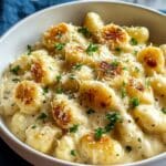 The dish shows a bowl filled with small, soft gnocchi pieces covered in a creamy, white sauce. The top layer is golden and crispy with browned spots, showing melted cheese that is slightly blistered. Small green herb pieces, likely parsley, are scattered on top, adding a fresh contrast to the creamy texture. The bowl is white and sits on a white marbled surface with a hint of cloth underneath. The overall look is warm, cheesy, and appetizing photo taken with an iphone --ar 4:5 --v 7