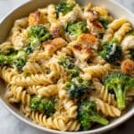 - Toss Pasta, Broccoli, and Chicken in Sauce: Add the drained pasta and broccoli to the creamy sauce, tossing gently to coat evenly. Fold in shredded rotisserie chicken last to keep it tender.