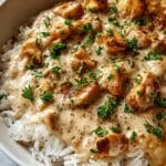 Creamy Smothered Chicken & Rice is a comforting, flavorful dish featuring tender chicken thighs or breasts smothered in a rich, savory cream sauce. The sauce is made with a combination of heavy cream, chicken broth, and Worcestershire sauce, enhanced by aromatic sautéed onions and garlic, and thickened naturally with a flour roux. Served over fluffy white or brown rice and garnished with fresh parsley, this hearty dish is perfect for cozy dinners and meal prepping.