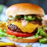 A close-up view of a cheeseburger with five layers starting from the bottom: fresh green leaf lettuce, bright red tomato slice, a thick grilled beef patty topped with melted yellow cheddar cheese, golden-brown grilled onions, and green pickled jalapeño slices, all covered with a creamy light orange sauce dripping slightly, held together by a soft, golden-brown burger bun on top. The burger is placed on a wooden board with scattered grilled onions and a single French fry, all set against a white marbled textured background. Photo taken with an iphone --ar 4:5 --v 7