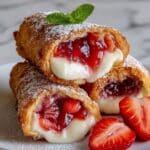 Delight in these Deep Fried Strawberry Cheesecake Pies, featuring a creamy cream cheese and strawberry filling wrapped in crispy fried egg roll wrappers or pie dough. A perfect indulgent dessert with a golden, crunchy exterior and sweet, fruity center, dusted lightly with powdered sugar for an irresistible treat.