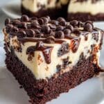 A close-up view of a slice of two-layered cake on a white plate with a white marbled texture beneath. The bottom layer is dark, moist chocolate cake with a crumbly texture. The top layer is thick, creamy beige cheesecake with visible dark chocolate bits inside, smooth in texture. The cheesecake is topped with many dark chocolate chips and drizzled with thin lines of dark chocolate sauce. The background shows the rest of the cake with similar layers and toppings in soft focus. photo taken with an iphone --ar 4:5 --v 7