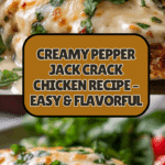 This Easy Pepper Jack Crack Chicken is a creamy, cheesy, and flavorful dish that’s perfect for a comforting weeknight dinner or a casual gathering. Made with tender chicken, pepper jack cheese, and a zesty ranch seasoning, it’s sure to become a family favorite in no time.