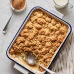 A white baking dish with blue trimming holds a golden brown crumble topped dessert, showing a textured, crumbly layer that is uneven and crispy on top. Inside the dish, part of the dessert has been scooped out with a silver spoon resting inside the hollowed area, revealing a soft, moist layer beneath the crumbly top. To the upper left of the dish is a small white ramekin filled with brown sugar or spice powder, and to the upper right, there is a white glass filled with light cream or milk. Everything is placed on a white marbled surface with a beige and white striped cloth partially visible at the bottom right corner. Photo taken with an iphone --ar 4:5 --v 7