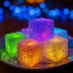 The image shows seven glowing cubes with a bumpy, almost bubble-like texture, closely placed in a circle on a white plate with detailed swirl patterns. Each cube shines with vibrant neon colors like blue, purple, yellow, green, and orange, blending smoothly and giving a glowing effect. The cubes look semi-transparent with light seeming to come from inside, creating a soft glow around each one. The plate rests on a white marbled surface and the background is dark with blue blurred lights, adding a dreamy feel to the scene. photo taken with an iphone --ar 4:5 --v 7