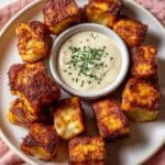 The image shows a white round plate on a white marbled surface, filled with about a dozen golden-brown, crispy cheese cubes with textured, slightly charred edges. In the center of the plate, there is a small white bowl of creamy white dipping sauce, garnished with chopped green herbs. The cheese cubes have a rich, crunchy exterior with a softer, melty inside visible on a few pieces. The plate is placed on a soft pink cloth, adding a gentle contrast to the white marbled background. photo taken with an iphone --ar 4:5 --v 7