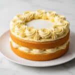 A white plate holds a two-layer round cake with light yellow sponge layers and a thick creamy filling of pale yellow between each layer. The outside is covered in smooth, light yellow frosting, with piped rosettes made of the same frosting arranged around the edge of the top. The top is dusted lightly with powdered sugar. The surface beneath the plate is a white marbled texture. photo taken with an iphone --ar 4:5 --v 7