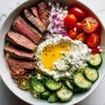 This Mediterranean Steak Bowl is a vibrant and wholesome dish featuring tender marinated sirloin steak served over a bed of nutritious cooked grains, fresh cherry tomatoes, and cucumber. Topped with a refreshing homemade tzatziki sauce made from Greek yogurt, cucumber, and fresh herbs, this bowl captures the bright and savory flavors of the Mediterranean diet. Perfect for a healthy lunch or dinner, it balances protein, vegetables, and grains for a satisfying meal.