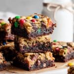 Keywords: monster cookie brownies, fudgy brownies, chocolate brownie recipe, cookie topped brownies, easy dessert, luscious brownies