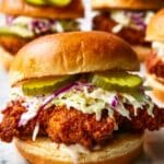Store leftover chicken and buns separately in airtight containers in the refrigerator for up to 2 days. Reheat the chicken in an oven or air fryer to maintain crispiness. Avoid microwaving to prevent sogginess. Assemble sandwiches fresh before serving.