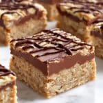 - Assemble the bars: Pour the chocolate mixture evenly over the oat crust, reserving about 1/4 cup for drizzling. Then spread the remaining oat mixture over the chocolate layer and gently press it down. Drizzle the reserved chocolate mixture on top.