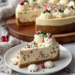 7. Decorate and Chill: Sprinkle holiday sprinkles over the white chocolate topping. Return the cheesecake to the refrigerator and chill for at least 6 hours or preferably overnight to fully set and develop flavors before serving.
