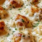 The image shows a close-up of a baked dish with several round, golden-brown dumplings or rolls sitting in a creamy, light beige sauce. Each dumpling is topped with melted white cheese that stretches slightly, and small green herb bits are sprinkled all over. The dish is shiny and looks hot, with a slightly browned surface on the dumplings. The photo is clear and sharp, highlighting the creamy texture and fresh herbs. Photo taken with an iphone --ar 4:5 --v 7