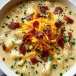 6. Combine and Serve: Fold in the cooked potatoes carefully so they don’t break apart. Serve the soup hot, garnished generously with crumbled bacon, shredded cheese, and chopped green onions as desired.