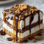 Keywords: peanut butter cookie lasagna, no bake dessert, layered peanut butter dessert, easy peanut butter recipes, refrigerator dessert