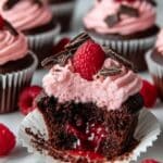 These Raspberry Chocolate Lava Cupcakes combine rich, moist chocolate cake with a surprise gooey raspberry center, topped with a luscious raspberry buttercream frosting and garnished with fresh raspberries and dark chocolate shavings. Perfect for chocolate and fruit lovers looking for an indulgent yet elegant treat.