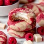 These Raspberry White Chocolate Cheesecake Cookies feature luscious pockets of creamy white chocolate cheesecake and tart raspberry jam tucked inside soft, sugar-coated cookie dough. Their delightful combination of rich cheesecake filling, tangy raspberry spread, and tender cookies makes them an irresistible dessert perfect for any occasion.