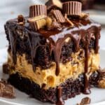 Reese’s Peanut Butter Earthquake Cake is a decadent chocolate dessert layered with creamy peanut butter, crushed Reese’s peanut butter cups, and topped with whipped topping and a rich chocolate drizzle. This crowd-pleasing, easy-to-make cake combines classic peanut butter and chocolate flavors for a heavenly treat perfect for parties and special occasions.