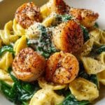 A luscious Italian-inspired main dish combining tender seared shrimp and cheesy three-cheese tortellini, all enveloped in a rich garlic cream sauce with fresh spinach and Parmesan. Perfect for a comforting yet elegant weeknight meal.