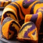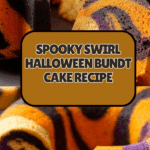 Celebrate Halloween with this Spooky Swirl Halloween Bundt Cake featuring vibrant neon orange, purple, and black swirls. This moist and flavorful cake blends vanilla, almond, and a hint of orange zest for a festive treat that’s as fun to make as it is to eat. Perfect for parties, this marbled Bundt cake is baked to golden perfection and can be finished with a simple glaze or powdered sugar dusting.