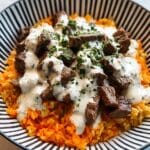 A white bowl with black thin vertical stripes holds a layered dish. The bottom layer is orange-colored rice with a slightly soft texture. Above the rice is a layer of bright orange sauce spread evenly. On top of the sauce, there are many small pieces of medium-cooked steak, showing brown outer edges and pink centers. A creamy white sauce with small herb bits is drizzled generously over the steak. The dish is finished with small green chopped herbs sprinkled on top. The bowl is placed on a white marbled surface. Photo taken with an iphone --ar 4:5 --v 7