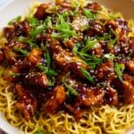 - Finish and Serve: Remove the skillet from the heat. Garnish the dish with chopped green onions and sprinkle with sesame seeds if desired. Serve immediately while hot and enjoy the irresistible sticky garlic chicken noodles!