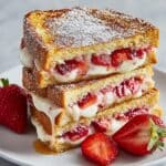Strawberry Stuffed French Toast is a decadent breakfast treat featuring thick slices of brioche or challah bread filled with a creamy mixture of softened cream cheese and fresh strawberries. The stuffed bread is dipped in a cinnamon-vanilla egg custard, then cooked to golden perfection in a skillet. Topped with powdered sugar, extra strawberries, and maple syrup, this French toast offers a delicious balance of creamy, sweet, and fruity flavors.