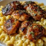 A white plate on a white marbled surface holds a serving of creamy macaroni and cheese with small, soft pasta pieces coated in a smooth yellow cheese sauce. On top, there are four golden-brown grilled chicken thighs with a slightly charred, shiny crust sprinkled with finely chopped green herbs and black pepper. The chicken thighs are arranged closely in the center, while the macaroni fills the plate underneath and around them. Photo taken with an iphone --ar 4:5 --v 7