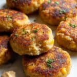 This image shows a close-up of six round, golden-brown patties with a crispy, browned surface and a soft, textured inside. The patties have small black pepper specks and bits of yellow corn visible within them. They are arranged closely on a white plate sitting on a white marbled surface. Some small green herb pieces are sprinkled on top of the patties as garnish. There is also a small dollop of light-colored sauce or spread resting on the plate near the patties. The lighting highlights the patties’ crispiness and moist texture. photo taken with an iphone --ar 4:5 --v 7