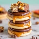A stack of three round cookies, each with a base layer of light golden biscuit, topped with a thick smooth caramel layer that drips slightly at the edges, followed by a shiny dark chocolate layer on top. The top cookie is crowned with chopped pieces of a candy bar that has a mix of creamy caramel, crunchy nougat, and chocolate coating, with a few small chocolate chips scattered around the base of the stack. The cookies sit on a flat surface with a white marbled texture. Photo taken with an iphone --ar 4:5 --v 7