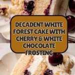 A luscious White Forest Cake featuring layers of moist white cake, rich white chocolate cream cheese frosting, and a homemade cherry filling. This elegant dessert combines classic flavors with a creamy frosting and fresh cherries for a perfect celebration cake.